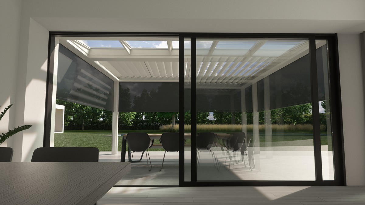 okiennice z wypełnieniem z drewna lub aluminium stanowią eleganckie dopełnienie pergoli i zapewniają dyskrecję